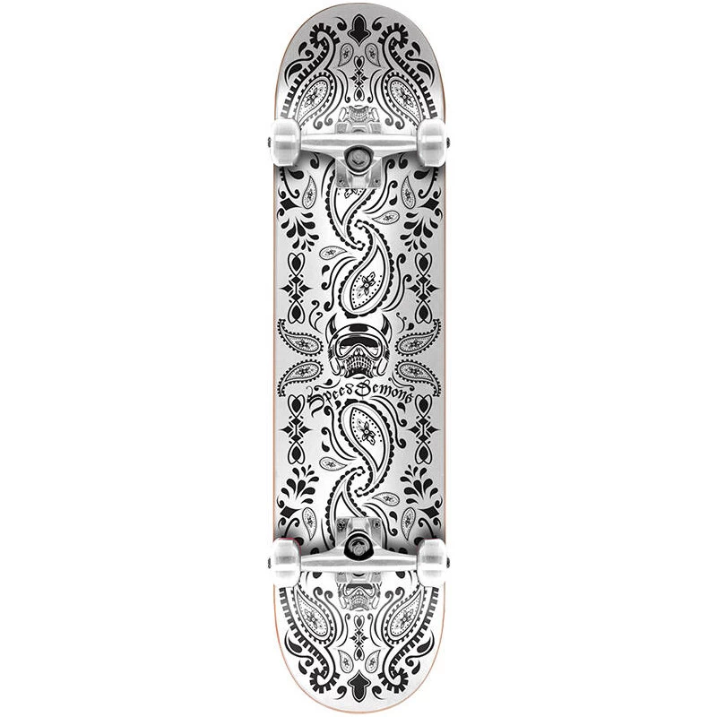 Skateboard complet SPEED DEMONS bandana blanc en 8″ idéal pour les jeunes débutants qui cherchent un skate pour apprendre leurs premiers tricks sans se ruiner.