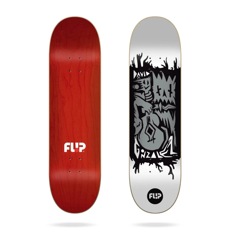 Planche de skateboard FLIP Gonzalez Block 8.0″, le pro model du rider David Gonzalez, au design noir, gris et blanc hyper graphique.