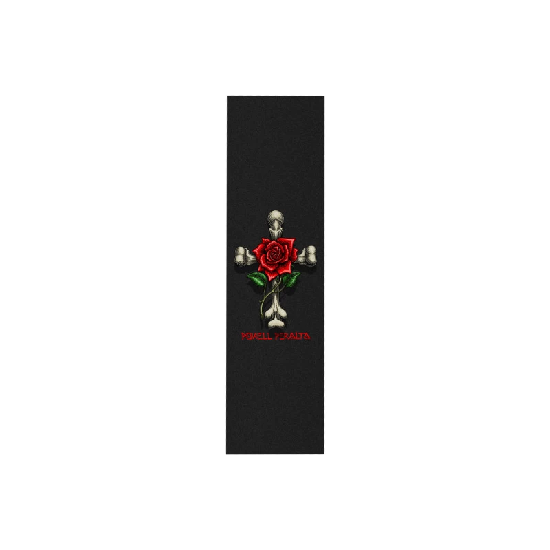 Grip POWELL PERALTA Rose Cross en 9″ pour skateboard. Grip noir original et hyper graphique avec une rose rouge dessinée sur une croix de squelette.