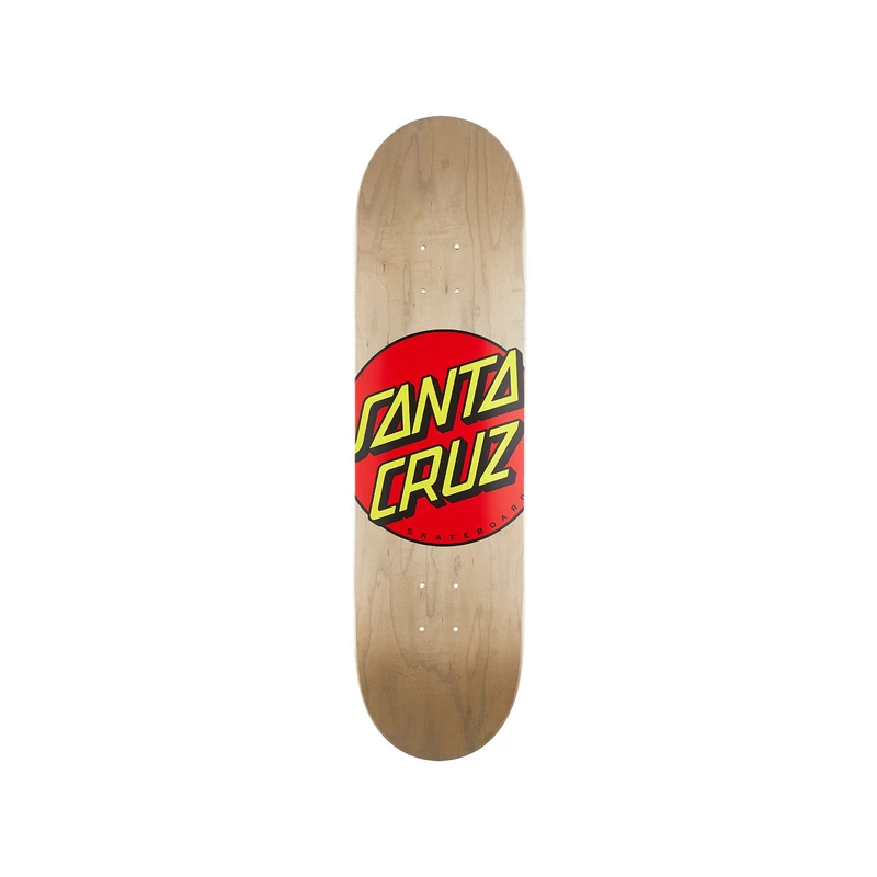 Planche Santa Cruz skateboard Classic Dot en 8.375″, avec le célèbre et indémodable logo Santa Cruz sur fond bois.