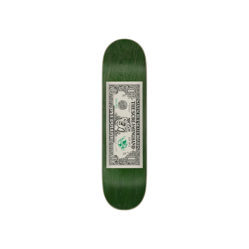 Planche de skateboard SANTA CRUZ Dollar Hand en 8.25″, avec un billet de dollar américain revisité façon Santa Cruz…