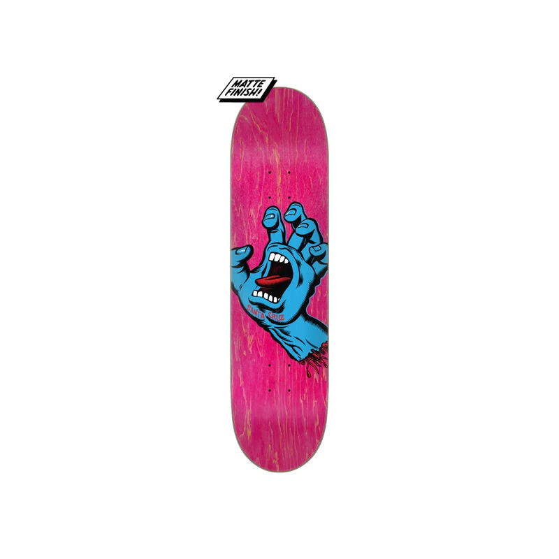 Planche Santa Cruz skateboard Screaming Hand en 7.8″, avec le célèbre et indémodable logo Screaming Hand sur fond rose.
