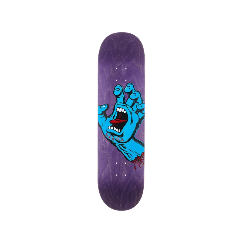 Planche Santa Cruz skateboard Screaming Hand en 8.375″, avec le célèbre et indémodable logo Screaming Hand sur fond violet.