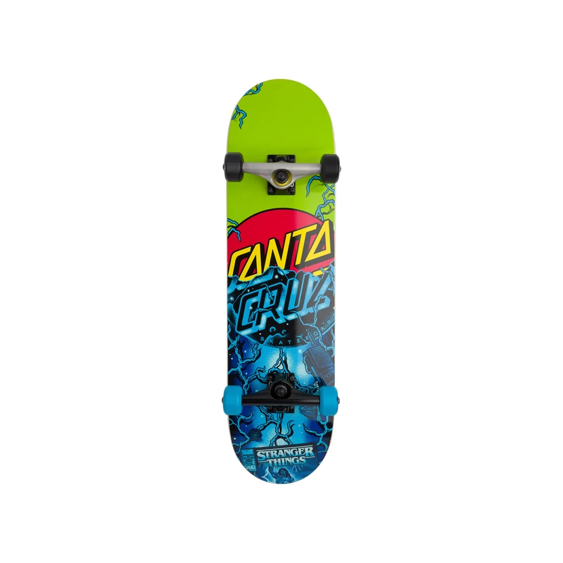 Skateboard complet SANTA CRUZ x Stranger Things Classic Dot en 8.25″, issu de la collaboration entre la marque de skateboards Santa Cruz et la célèbre série Netflix Stranger Things.