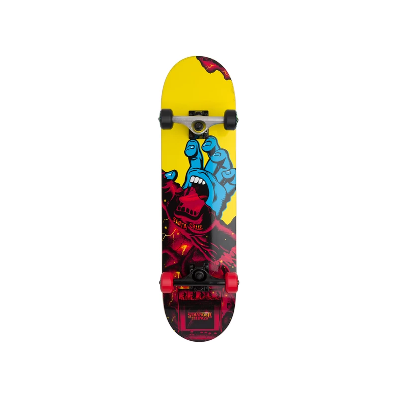 Skateboard complet SANTA CRUZ x Stranger Things Screaming Hand en 8″, issu de la collaboration entre la marque de skateboards Santa Cruz et la célèbre série Netflix Stranger Things.